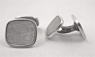 A. Tillanderin valmistamat hopeiset kalvosinnapit, jotka ovat tyylikkyydessään voittamattomat. Näissä sodanaikaisissa kalvosinnapeissa on Omega -kellomerkin logo stanssattuna. Koko 1,5 x 1,7 cm.